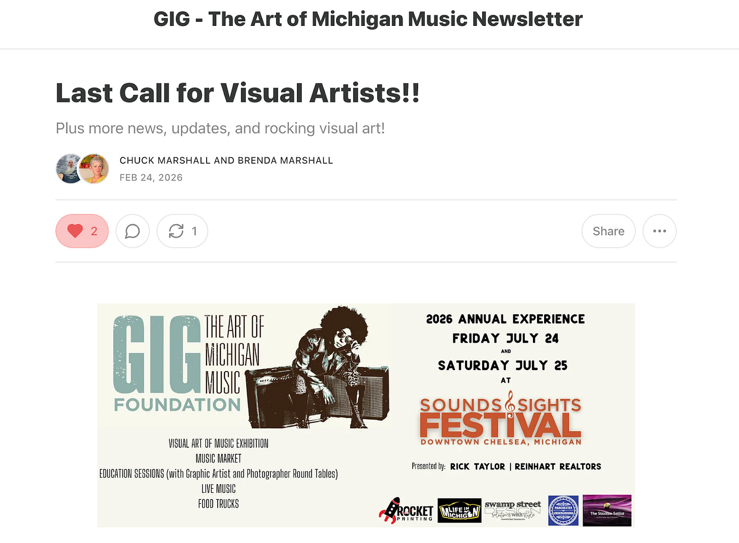 The latest news from GIG - The Art of Michigan Music is out now via the GIG newsletter. Be sure to sign up to stay in touch and mark your calendars for Friday, July 24, and Saturday, July 25 to see GIG at Chelsea Sounds & Sights.