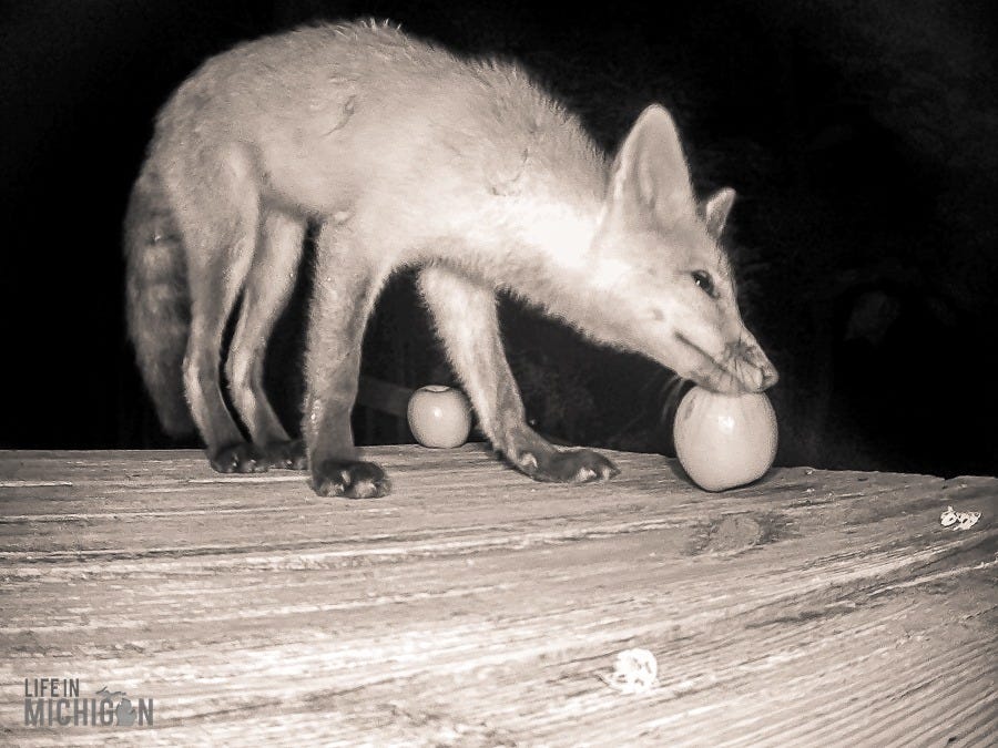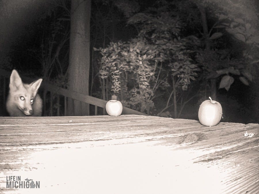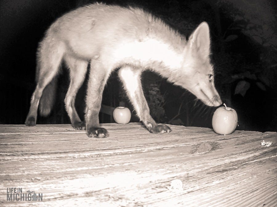 There were more than a couple of nights where we woke to what sounded like a woman screaming bloody murder. Thankfully, no serious mischief was occurring other than the neighborhood fox making the rounds. We set up our trail cam to uncover some of the nightly shenanigans. Who knew the fox would be curious about apples?