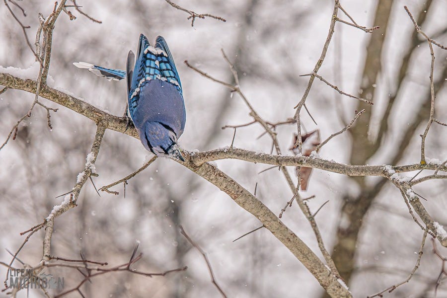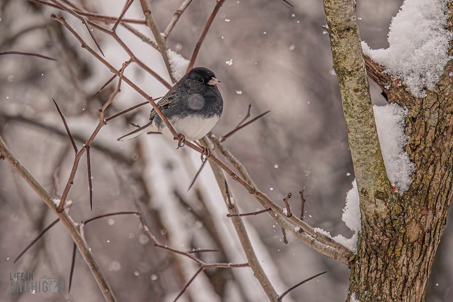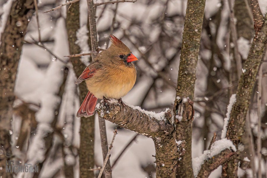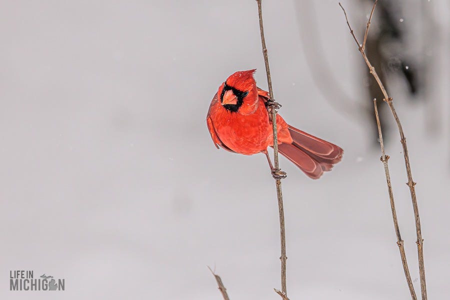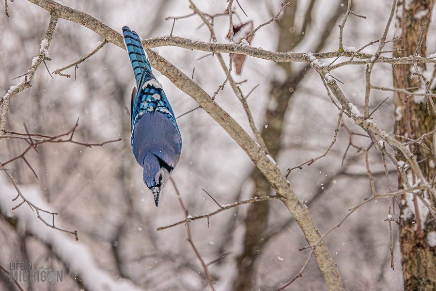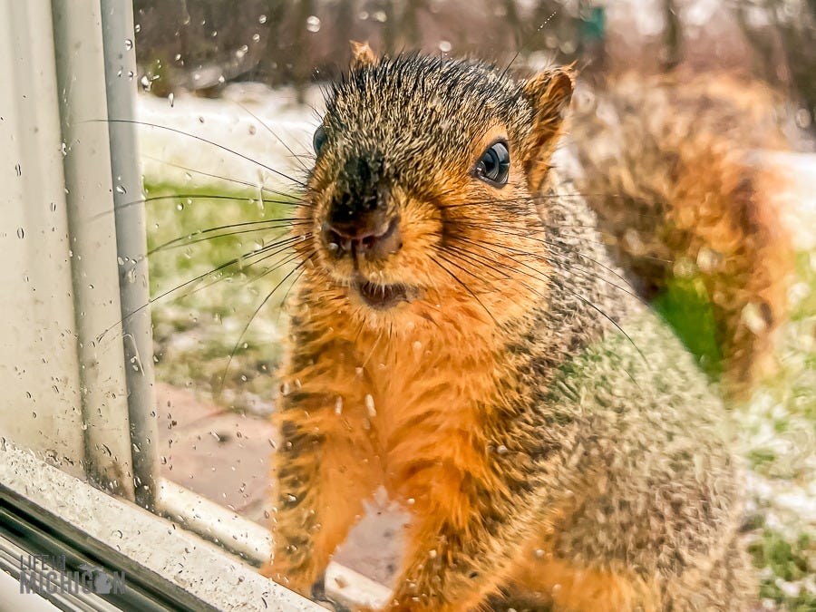 Happy New Year, and welcome to another year of the Life In Michigan Sunday Sip newsletter. If you’ve been reading Sunday Sip for a while, you know we’re pretty enamored with our backyard friends. Just last week, Brenda shared our horror of witnessing Karen, the black squirrel, encounter our sparrow deterrent system (fishing line and washers). Anyway, I’ve been seeing a few photographic journal-type deals here on Substack. You know, the ones where someone takes you on a journey or tells a story with a series of photos and perhaps a few words here and there to set the stage. Well, with that inspiration, I thought I’d share a retrospective on our backyard pals.