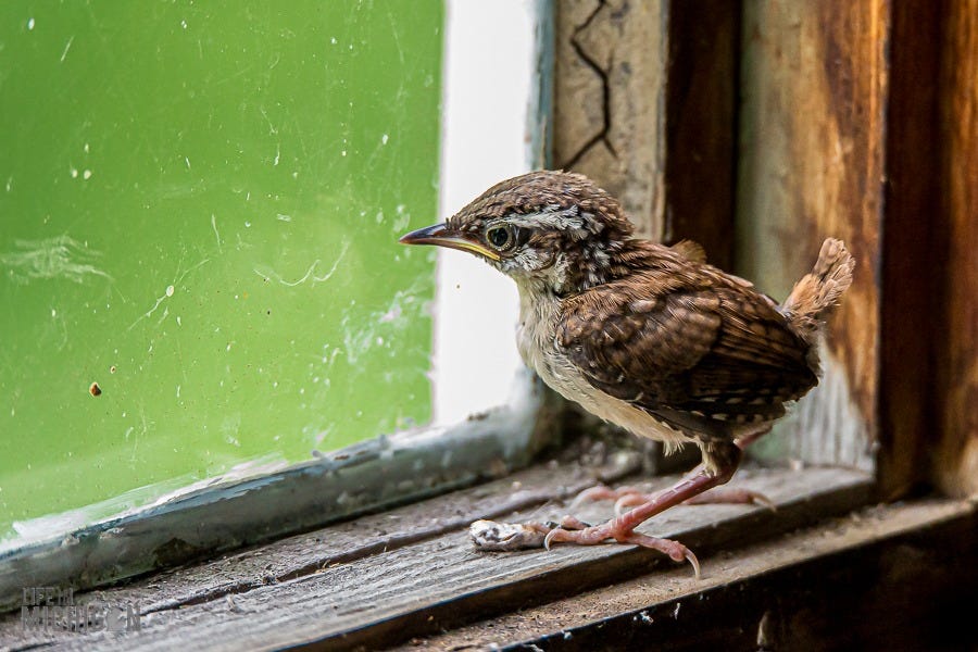 For some reason, a house wren found our garage rafters to be the perfect spot for a nest. One day, a couple of little chicks fluttered about inside the garage, desperate to get out the window. I imagined this little one looking outside and thinking, “Hey buddy!! Put the camera down and open the damn window!” Since the windows didn’t open, we left the garage door up. After a bit of futile flapping by the window, they figured it out and busted a move for the great wide open.