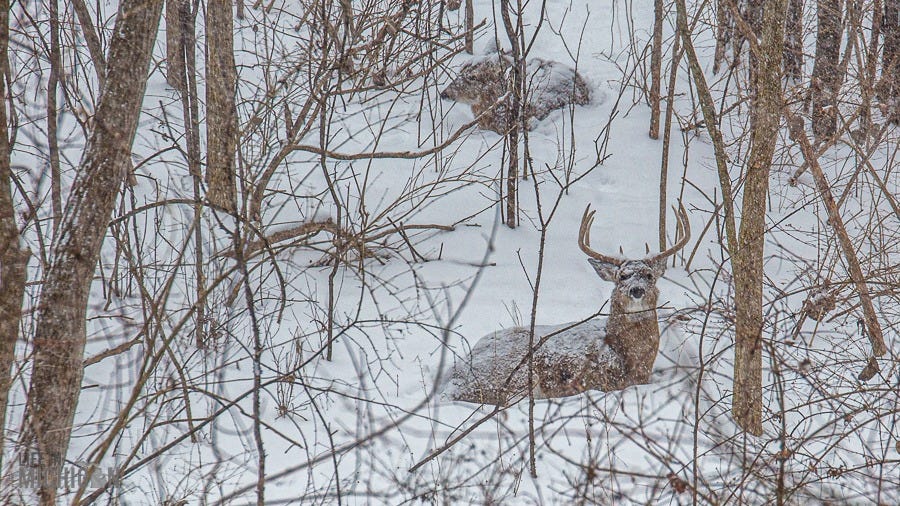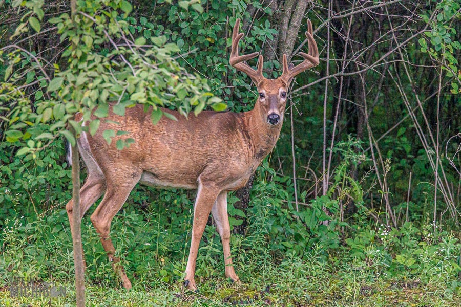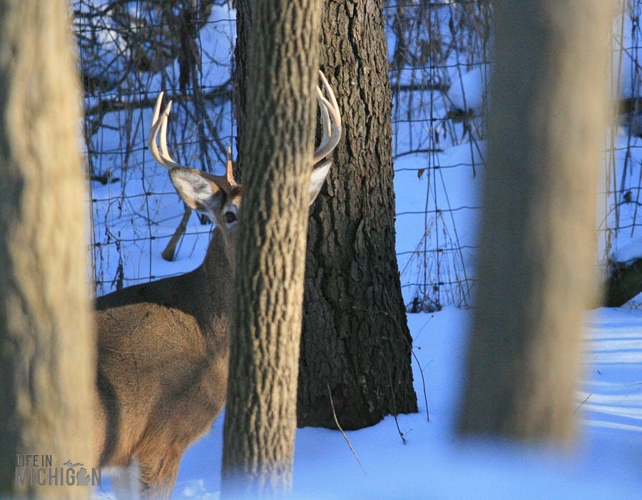 The deer have also stopped by on occasion. While we have seen fawns, they aren’t quite yet sleeping outside the window. However, this big fella will stroll by from time to time.