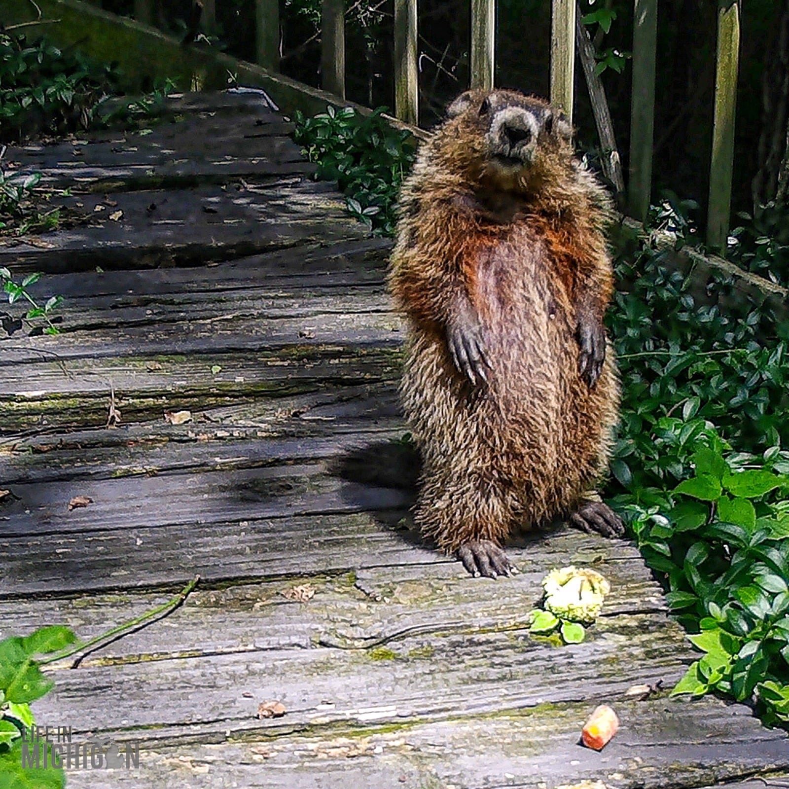 The backyard at the house on Ann Arbor’s northside had a steep slope. Under a section of old decking that was giving way to nature, lived our resident woodchuck. We named him Winston. He was quite a character who enjoyed nuts and carrots. However, his extended family was problematic. We ended up having to evict his relatives who tried to set up residence near our basement wall.