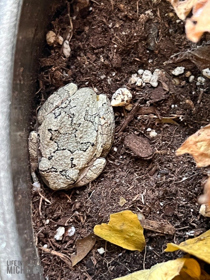 I would be remiss if I failed to mention Steve the tree frog. He spent a winter inside our house after stowing away in one of the potted plants we kept on the deck in the summer. Steve enjoyed the balmy indoors until spring, when we took them back outdoors. We’ve not seen Steve in a bit, but we hope he is doing well in the backyard.