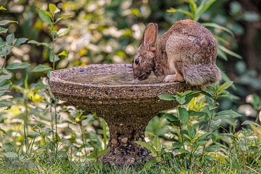 There is also Flossy the rabbit, who enjoys hot summer evenings and cool drinks at the bird bath.