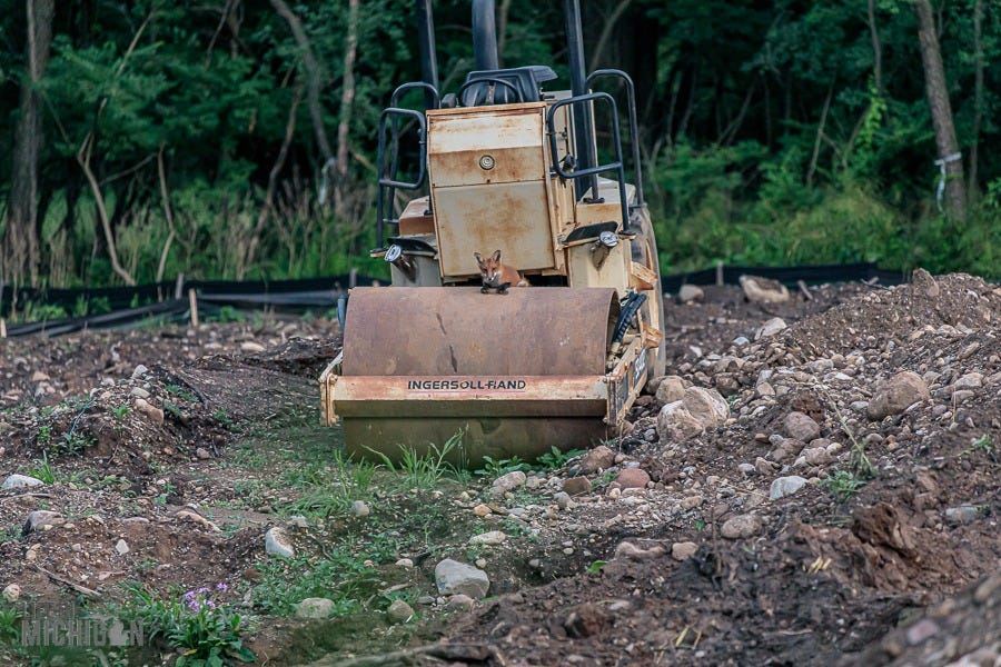Sadly, a developer bought the two-acre plot next to our house. Instead of building a single home and retaining the wooded nature, they leveled every tree. Seeing the fox sitting on the heavy equipment amongst the forest devastation, I felt they were protesting the destruction of their home.