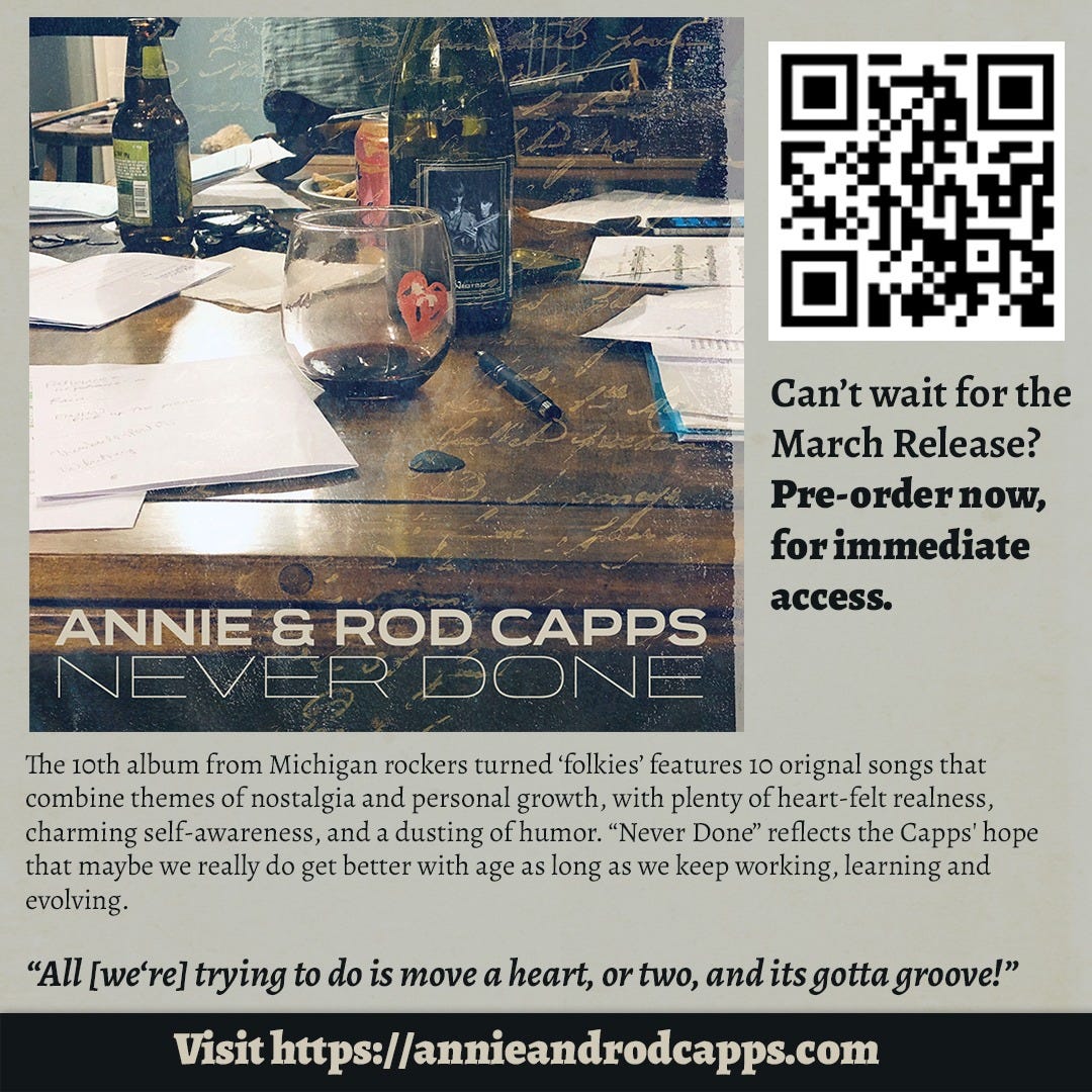 Lately, I’ve been spinning (in the digital sense) my advance copy of the new release from Annie & Rod Capps called Never Done. This is the band’s tenth album, and it radiates with honesty, wit, and wonder. Each track shimmers with a unique and introspective look at the moments that color and enrich our lives.