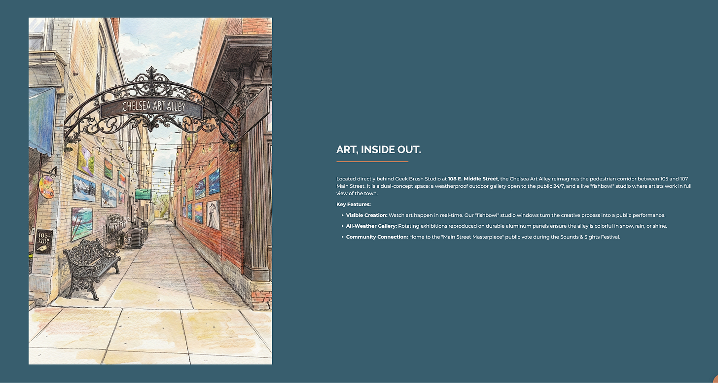 Last but not least, Geek Brush Studio in Chelsea is spearheading an effort with the city to turn the alley between 105 and 107 Main Street into the Chelsea Art Gallery. They are currently seeking artist submissions to display in this new outdoor art space. Submissions are due by April 1, 2026.